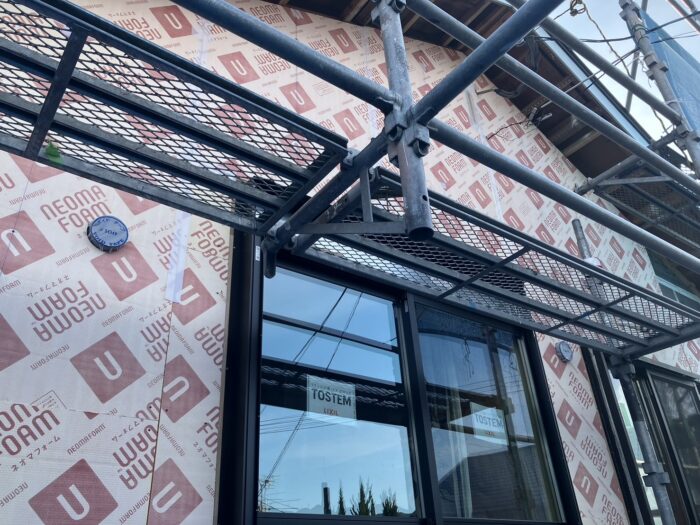 既存の外壁材を剥ぎ45mmの断熱材を外貼りしている途中です。