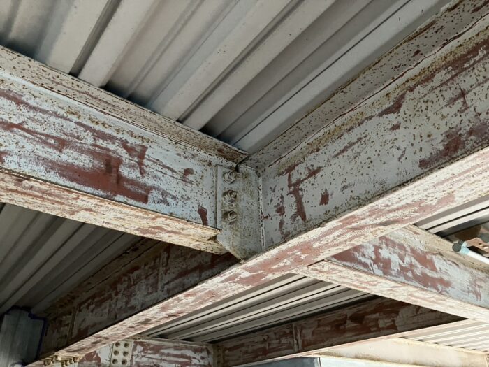 H鋼には元々錆止めとその上に塗料を重ねて塗装してあります。しかし、錆止めを塗装していても時間経過と室外ということもあり錆が浮き出てしまいます。