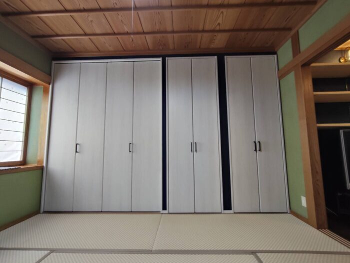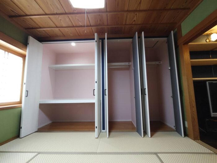 前回は解体の様子でしたが、既に床の間からきれいなクローゼットへとリフォームが完了しております。構造上、取り外しができない柱もあり大き目なクローゼットとコンパクトなクローゼットを2つ作成しました。和室に白色の扉(建具)と紺色の壁で上品な色合いになりました。