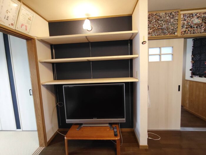 施工前は真ん中に照明器具があり囲われた空間でしたが、テレビの上部を有効活用する為背面を補強し、可動棚を設置しました。棚板は設置したレール上で好きな高さへ動かすことができ飾るものによって調整できます。背面は床の間に使用した同じ紺色でアクセントカラーになり締まった雰囲気になりました。