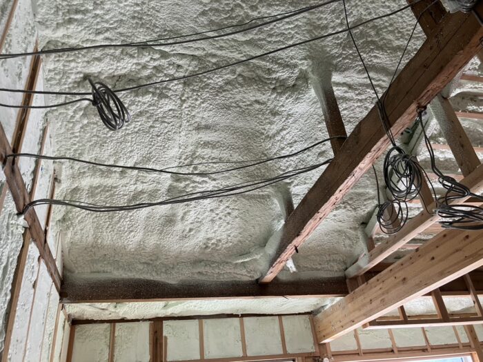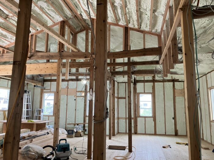現在解体が終わり必要な補強などを施工し断熱材の吹き付けが終わったところでした。