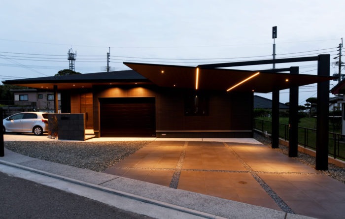駐車場の床部はスリットを入れ、粗目仕様のタイルを貼り、カーポート屋根内部と既存建物軒裏の木目調の色合いに絶妙なバランスに、SCダウンライトとシームレスライン照明が醸し出すコントラストがお家全体とマッチしたカッコいいカーポートになりました。